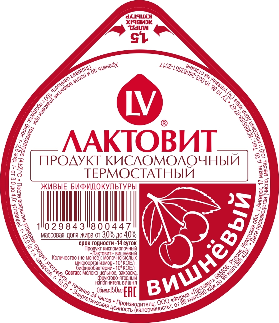 Обладает многими полезными и лечебными свойствами для организма. Кумарин, содержащийся в вишне, снижает свёртываемость крови. Эта особенность вишни позволяет использовать её для профилактики осложнений атеросклероза артерий, а удачное сочетание в вишне витаминов С, В1, В6, железа, магния, кобальта, пигментов – благотворно для предупреждения и лечения малокровия. Регулярное включение в рацион питания продукта «Лактовит вишнёвый» снижает риск подагры, повышает устойчивость организма к неблагоприятным воздействиям, в частности к повышенному радиационному фону. Состав: Молоко цельное, закваска, фруктовоягодный наполнитель вишнёвый